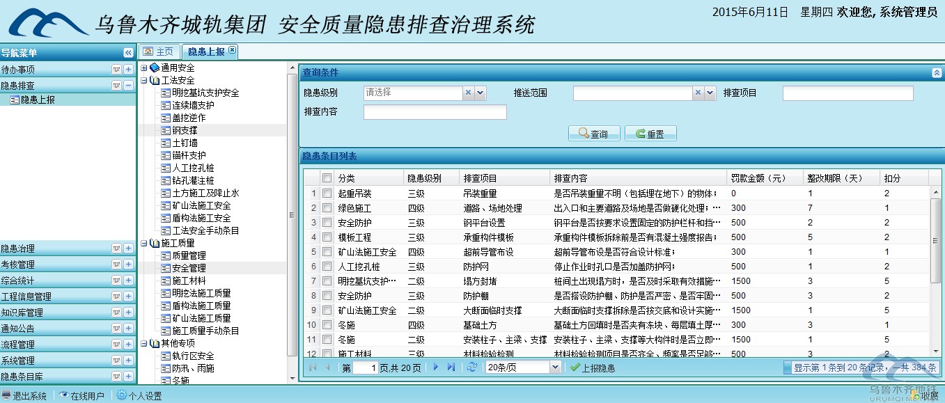 近期,我市軌道交通建設(shè)安全質(zhì)量隱患排查治理信息系統(tǒng)正式上線投入使用,標(biāo)志著我市軌道交通建設(shè)質(zhì)量安全向信息化和規(guī)范化管理更進(jìn)一步。年初,按照市建委關(guān)于創(chuàng)新工作思路和舉措的要求,市軌道辦(城軌集團(tuán))制定了4方面25項(xiàng)工作新思路新舉措,其中,軌道交通建設(shè)安全質(zhì)量隱患排查治理信息系統(tǒng)就是其中一項(xiàng)重要的思路舉措。為此,市軌道辦(城軌集團(tuán))充分借鑒北京軌道交通建設(shè)管理方面的經(jīng)驗(yàn)教訓(xùn),精心組織籌劃,緊鑼密鼓開展各項(xiàng)工作,前期做了大量的調(diào)研并收集了第一手基礎(chǔ)資料,組織編制完成了《烏魯木齊城市軌道交通工程建設(shè)安全隱患排查與治理管理辦法》,為提升管理手段,實(shí)現(xiàn)管理的信息化,組織專業(yè)技術(shù)人員和相關(guān)咨詢公司共同攻關(guān),開發(fā)了安全質(zhì)量隱患排查治理信息系統(tǒng),從開發(fā)、測(cè)試直至上線運(yùn)行僅用時(shí)3個(gè)月。該系統(tǒng)具有完善可行的安全質(zhì)量隱患報(bào)送、處置與考核制度,主要功能模塊包括門戶首頁、隱患排查、隱患治理、考核管理、綜合統(tǒng)計(jì)、工程管理、文檔管理、通知公告、系統(tǒng)管理以及隱患條目庫等十個(gè)方面。