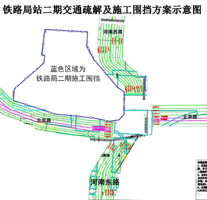 鐵路局站是1號線和4號線換乘站,目前,1號線車站部分正在進行二期主體結(jié)構(gòu)施工,在市公安局交警支隊、市交通運輸局等單位的大力支持及配合下,市軌道辦、城軌集團統(tǒng)籌協(xié)調(diào),會同各相關(guān)單位進行了大量現(xiàn)場實地勘察并作出針對性調(diào)整方案。計劃5月10日零點起對現(xiàn)狀交通方式進行二次導改,直至11月30日。主要圍閉現(xiàn)行西側(cè)機動車道(鐵路局獻血屋一側(cè))。
