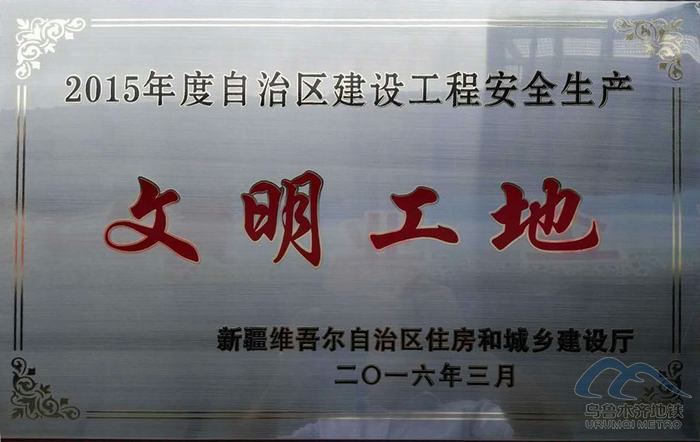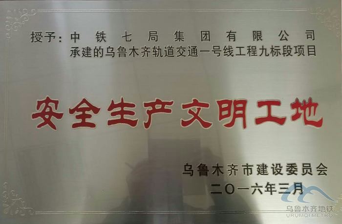 2016年5月,新疆維吾爾自治區(qū)住建廳向烏魯木齊軌道交通1號線的09、10、13、14、17標段授予2015年度自治區(qū)安全文明工地獎牌和榮譽證書,這是軌道交通1號線工地獲得2015年烏魯木齊市級安全文明工地后取得的另一榮譽。