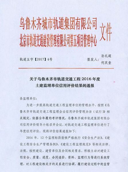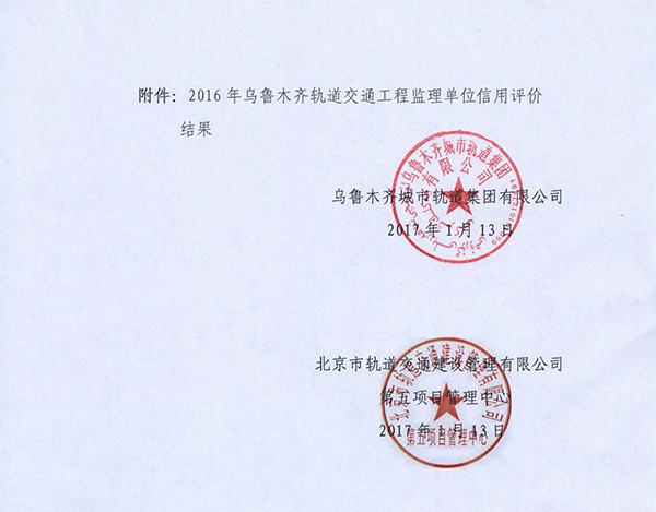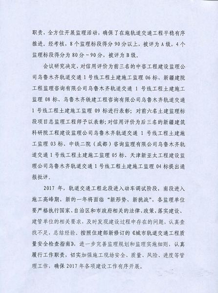關(guān)于烏魯木齊軌道交通工程2016年度土建監(jiān)理單位信用評價(jià)結(jié)果的通報(bào)