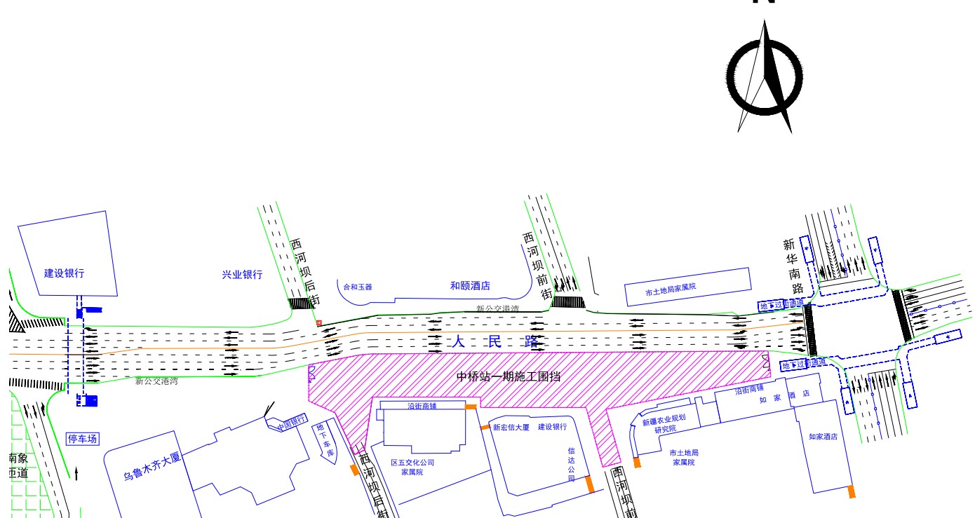 受施工影響,人民路南側的西河壩前街路口與西河壩后街路口封閉,車輛無法從人民路進出。人民路立交橋公交車站(西向東)向西遷改120米至人民路立交橋上。為消減施工路段交通流量,封閉人民路立交橋由北向東、由南向東方向匝道,(如圖所示)